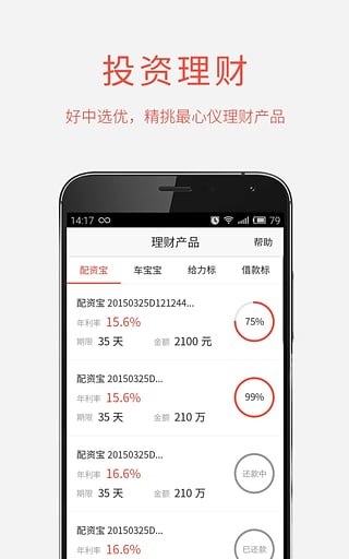 1、灵活理财产品:借款标,最低一天,50元起投。一天快速提现,轻松周转资金2、定期产品:短期宝、车宝宝、给力标多种选择,您投资理财首选之作,100%本息保障