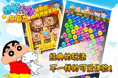 蜡笔小新泡泡龙是一款休闲消除类游戏,蜡笔小新泡泡龙在延续经典的同时,更与动漫中的元素巧妙结合在一起,将整个游戏的世界观更庞大的展示给每一位热衷的动漫玩家!想要在蜡笔小新泡泡龙中获得高分,就要学会如何打泡,打的一手好泡可以获得更高的分数。2015年,我们传递永恒,搬运经典。作为游戏行业的搬运工,我们不间断的从欧美,日韩,东南亚等多达数十个国家搬运最原汁原味的正版游戏。将最原汁原味的快乐带到中国,带到大陆,带到所有安卓智能手机之上。