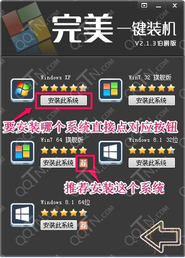 这里会出现一个“荐”字,这个就是完美一键装机软件自动检测出您这台机子的硬件配置然后通过配置推荐您装什么系统最好,当然这只是一个参考,您也大可以装其它系统。但是如果出现一个“危”字的话,最好别装这个系统,装的话极大可能会导致安装的过程中会出现蓝屏等,不确定的因素。(提示:鼠标移动到“荐”字或者“危”字就会出现本机系统的配置信息。)选择您想要装的系统,然后直接点击安装此系统接下来完美一键装机软件,就会下载这个系统。