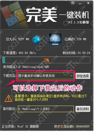 提示:完美一键装机软件支持断点续传,在下载文件时您大可以随时关闭软件,下次在运行软件安装选择相同的系统,软件会接着上次下载的进度继续下载。 进入下载页面了,在这个页面里有个下载完成后的选项,默认是“提示重启手动确认安装系统”,意思是说系统镜像文件下载完成后,会弹出个询问框,问您是不是要现在立即重启并安装系统。“只下载系统,不安装系统。”这个没什么好说的,就是只下载系统镜像文件保存在硬盘,先不安装系统。“无需确认自动重启并安装系统”,下载镜像完成后,电脑就会直接重启并安装系统,如果您人不在出去外面了,可以选择这个。