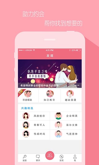 5、最有效的交友平台:高级搜索覆盖经济情况、情感状态、兴趣爱好等维度,确保找到合适的人;约会、两性信息,帮助你了解异性,确保交往成功率。