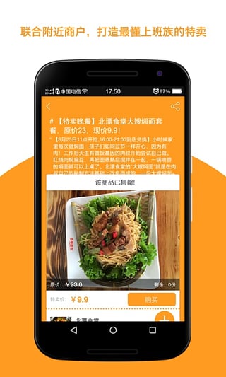 好近APP安卓版是一款简单实用的手机外卖O2O软件。现在都流行手机叫外卖,这款软件是不错的选择。好近APP界面简洁,一目了然。为上班族提供附近500内的所有特卖,各个时段全部都有,超级方便!