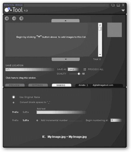 Digital Image Tool V2.0 英文绿色免费版 Digital Image Tool 是一款让你可以在批量选择的图像上执行普通图像操作的简单的图像处理工具.该软件支持灵活的的图像尺寸重新设置,旋转,剪切,缩放,使用前缀/后缀和递增数字重命名以及添加水印图像覆盖图(无论是通用的还是定制的).