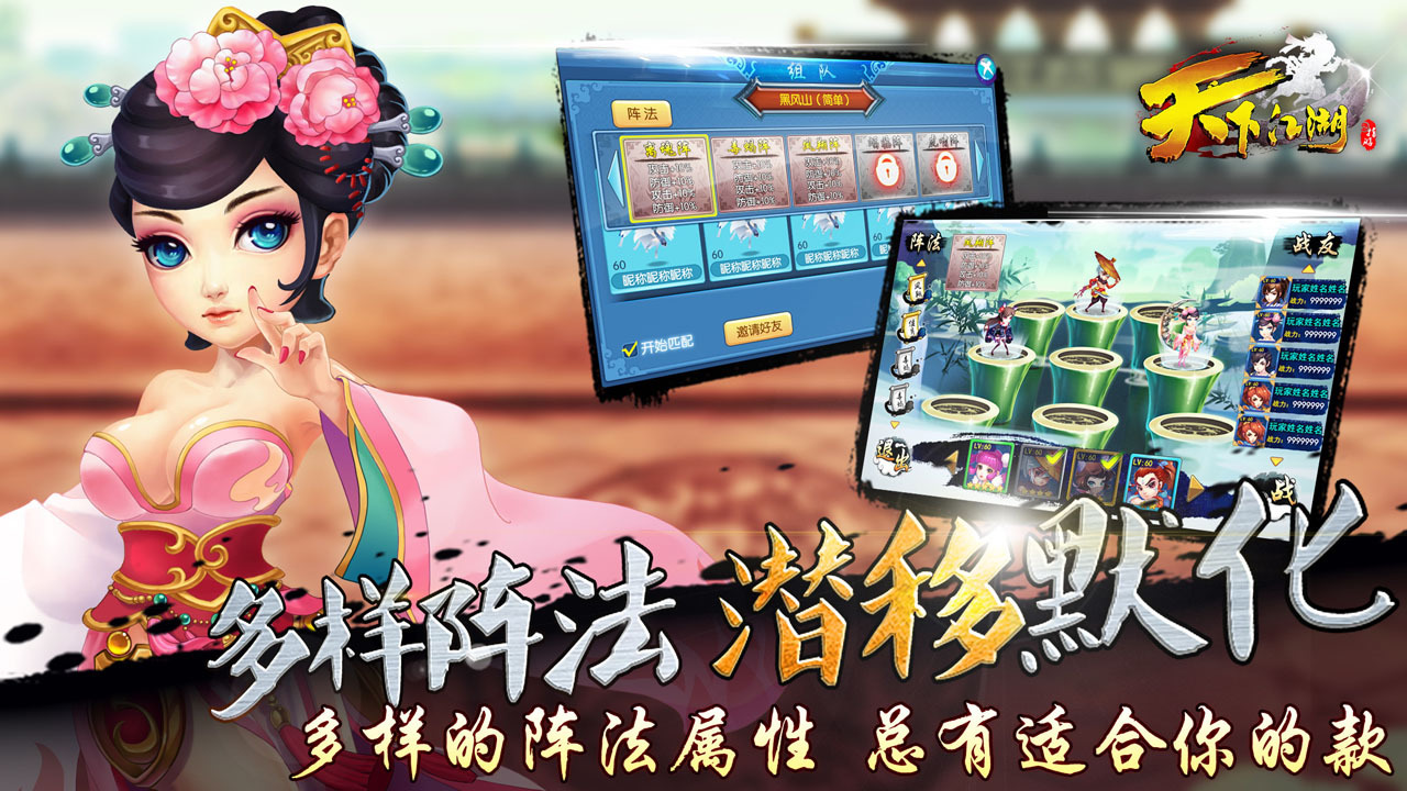 《天下江湖》新江湖,真武侠。由央广视讯独家代理,同名小说正版授权的MMORPG武侠手游《天下江湖》。勇闯新江湖,感悟真武侠,将带来全新的武侠江湖风暴。 摒弃了传统RPG枯燥的“回合制战斗模式”,采用目前较先进的“即时战斗模式”,极致体验的PK快感,简洁明快的操作界面,华丽炫目的技能施展,让玩家在游戏中更真实的体会原汁原味的真武侠。 私人定制属于玩家的江湖大侠,无论是砥柱少林、问剑武当【特色介绍】