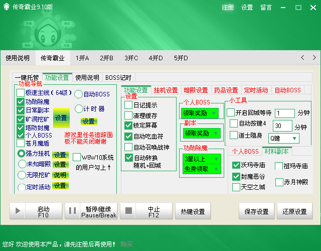 说明:打装备给大号换经验一星期6转不是梦自动判断刷新BOSS,自动等BOSS刷新,自动抢BOSS。可刷BOSS,可刷小怪,也可边刷BOSS,BOSS没刷新的时候刷小怪。支持死亡复活掉线重连后自动花元宝进未知暗殿,包满合成等功能附加,因为没有意义。包满后可选择出去合成和捐到公会仓库中。效率:辅助毕竟不是人手,所以抢BOSS效率不高。但是人少的时候刷副本卷轴很给力。