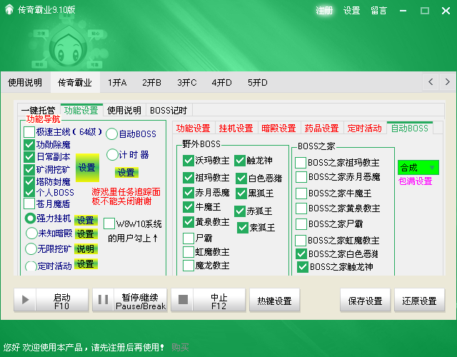 说明:此任务自动击杀BOOS之家和野外BOOS、只击杀二转游戏以下,三转BOOS暂不支持效率:辅助毕竟不是人手,所以抢不过真人。但是人少的区深夜可以使用。