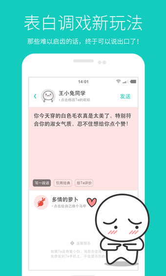 羞小白是一款基于熟人的匿名聊天手机软件,使用这款软件,用户可以单向匿名向好友发送消息,也可以发送匿名状态,大家都可以大大方方的用另一个身份讲出自己平时深藏在心底的话了。