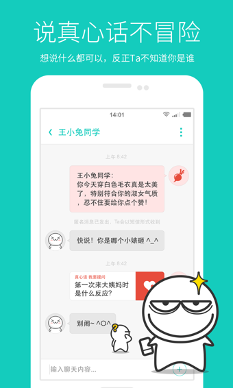 熟人之间匿名聊天,讨论劲爆的私密话题,玩真心话游戏,平时不敢说的话现在可以尽情表达了!