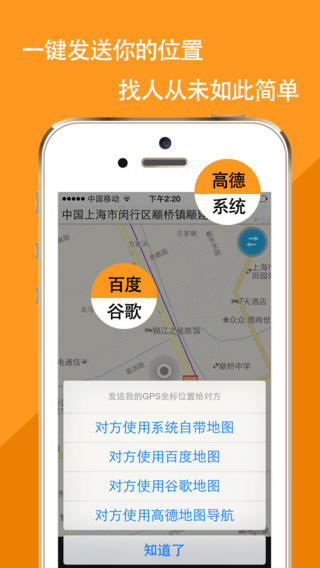 发个短信,就知道你在哪里了。有急事,直接打开应用,好友火速救援。机场轻松接人。找人不用愁。