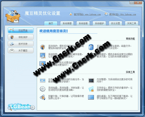 主功能:系统保护,系统清理,系统信息,系统维护,优化设置。