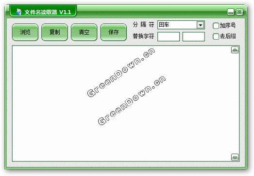 文件名读取器 V1.1 简体中文绿色免费版 一款批量读取文件名小软件。选择多个文件,可以读取到文件名,以用户定义的分隔符显示出来,还有给文件名加上序号,另存为文本文件等小功能。本人想这款软件一般情况下不会用到,但需要给磁盘中文件做一个目录的时候还是挺方便的,免了一个个去敲打的麻烦