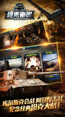 《坦克帝国》以二战为背景,汇集众多二战经典坦克,T-34、谢尔曼、虎式、豹式等200多种坦克尽数汇聚,组成强大坦克集群,展开世界范围的坦克拉锯战!