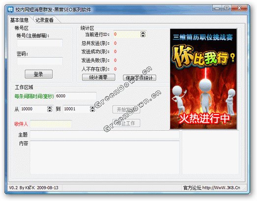 校内网短消息群发V0.2 *各项配置支持自动记忆; *指定ID号段进行群发; *支持统计保存、读取; 操作说明:间隔时间建议6000毫秒(6秒);工作区域段可从1-几亿,工作时会自动读取收件人姓名,如果无收件人将自动跳过执行下一位