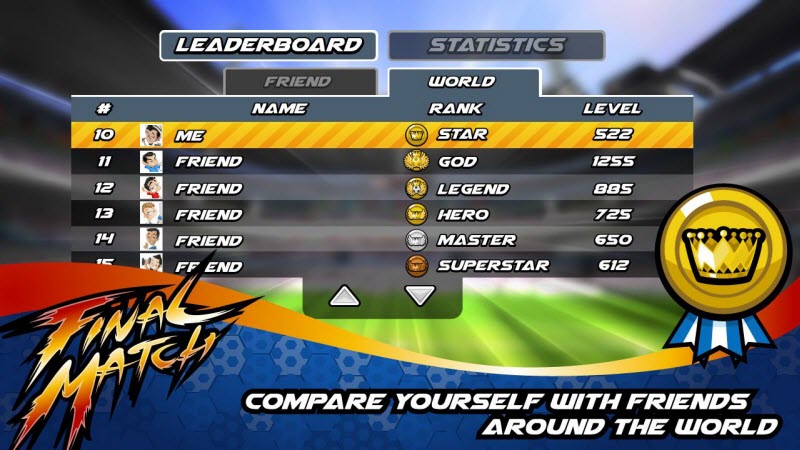 最终之战是一款好玩易操作的足球竞技游戏,玩家可以进行一个1V1的足球对战,你将和你选择的对手进行一场势均力敌、针锋相对的足球比赛。而你的最终目的就是踢球射门,成为足球传奇。