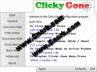 Clicky便携式提供了一个快捷的方式来隐藏选定的应用程序的窗口。只需按住用户定义的键盘键并您要隐藏点击的窗口标题栏中。该程序也可以隐藏活动窗口 ,并选择哑的声音,通过采用一种'老板'键盘快捷键