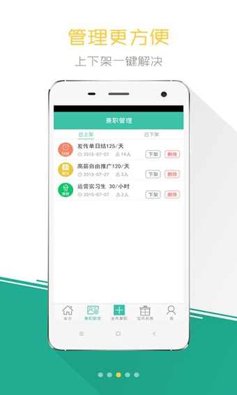 兼职信息上下架一键解决,及时查看报名及录用信息;