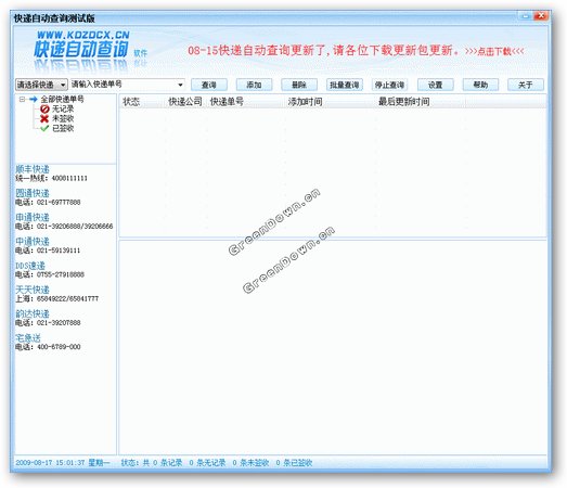 快递自动查询测试版 V1.0 简体中文绿色免费版 快递自动查询是一款完全免费软件,不存在任何功能或时间限制。适用于在网上开办网络商店的用户使用,如:拍拍、淘宝、易趣、有啊、其他网站、ShopEx等网店卖家。快递自动查询顾名思议就是“自动”查询快递单号的货物配送进度,目前支持网店主流快递公司的快递单号查询(例如:顺丰、申通、圆通、中通、天天、DDS、韵达、宅急送),有了快递自动查询帮助你节约了大量的时间,使你有更多的时间与顾客沟通,以此提高你的网店服务品质