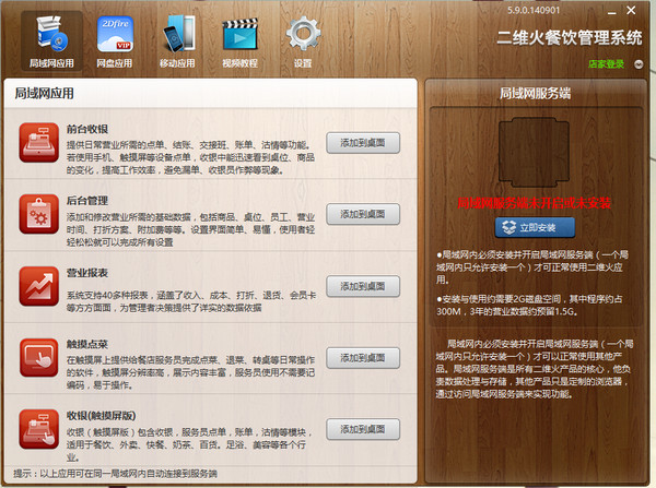 软件完成安装后,运行桌面上【二维火餐饮管理系统】,出现如下图界面。点击“立即安装”安装“局域网服务端”,如果出现的360拦截,点击“更多”选择“允许本次操作”