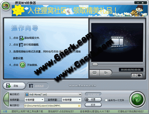 狸窝mp4视频转换器 v4.1.0.0 简体中文官方安装版 狸窝mp4视频转换器是一款功能强大的rmvb转mp4视频转换器,它可以将几乎所有流行的视频格式,如:RM、RMVB、VOB、DAT、VCD、DVD、SVCD、ASF、MOV、QT、MPEG、WMV、MP4、3GP、DivX、XviD、AVI等视频文件转换为MP4机、智能手机、AppleiPod所支持的视频格式。