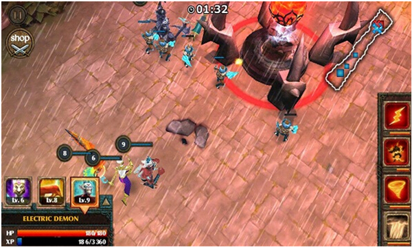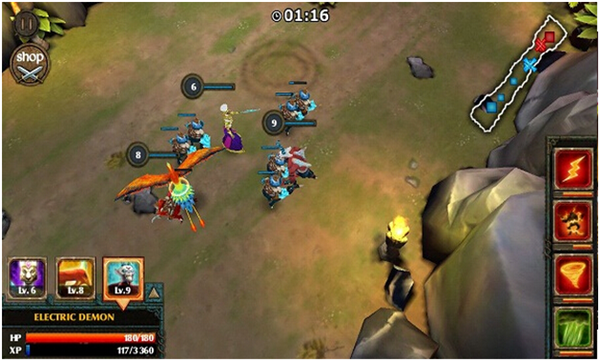 游戏里的每个英雄的技能都有着相当细致的表现,像是旋风斩啊、圣光啊、践踏(其实已经算是跳踏了)之类的,以及一些技能给目标造成的不良BUFF(中毒、眩晕神马的),都会有表现出来。甚至在英雄濒临死亡的时候,屏幕四周还会变得血红并且一闪一闪的警告玩家赶紧逃命回血。在游戏中玩家一共可以控制三个不同的英雄,通过左下角的英雄头像图标(这里还会显示英雄的HP和XP),可以实现快速的切换控制。而右侧则是每个英雄的技能快捷按键,一共有四个。直接点击就能触发技能,直接发动或者需要手动选择释放位置。技能使用会有冷却时间,在技能快捷栏图标的下方会显示冷却时间。另外 底端中间是各种道具的快捷栏,买了道具之后就能在这里点击使用。