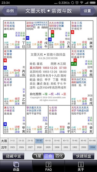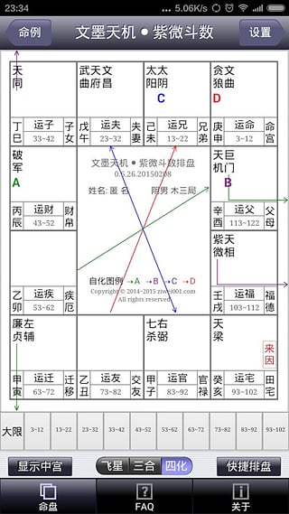 3.提供精心设计的排盘界面,风格简约而不简单,兼容命理师和紫微斗数爱好者的既有使用习惯,盘面布局和配色风格与使用广泛的飞星、三合排盘软件保持一致,大幅降低使用门槛。