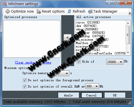 Minimem V1.30 英文绿色免费版 Minimem是一种很实用的工具,它可以减少应用程序运行时所需的内存,在后台运行时,它周期性地( 默认情况下30秒)将内存的使用降到最小。它的功能主要是靠将内存的内容存储到硬盘的交换文件或页面文件上,暂时为其他程序的运行提供内存空间来实现的。这对那些使用旧PC或较小内存的用户帮助很大.