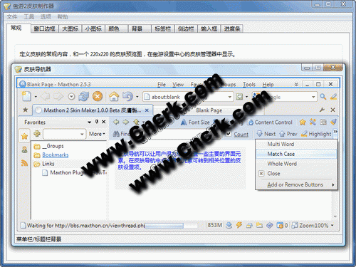傲游2皮肤制作器 V1.1.9 简体中文绿色免费版 傲游2 [Maxthon] 皮肤制作器。皮肤制作器并非插件,而是独立运行的小程序,但不需要安装,解压后双击 SkinMaker.exe 便能运行。皮肤制作器内置 皮肤导航 及 图案切割 2 个工具,皮肤导航是帮助用户快速找到一些主要介面元素的皮肤制定项目,而图案切割则是方面 port 皮肤