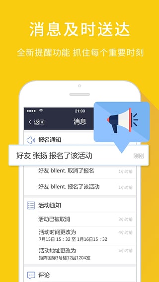 发布、报名、收藏、邀请等所有活动一目了然,分类管理。消息、动态即时提醒,最忠诚的活动管理小秘书。