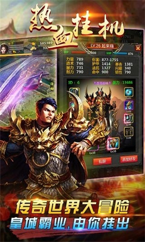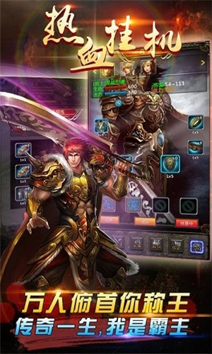 绚丽的游戏界面,为你打造完美魔幻世界!战、法、道,三大职业任你选!多变的PK技能、丰富的玩法和剌激的副本BOSS等你来体验!快下载《热血挂机HD》缔造巅峰传说,打造不朽传奇吧!玩法和剌激的副本BOSS为一体。“战士,道士,法师”三大职业,行会战,华丽特效满屏呈现,让我们一同缔造巅峰传说,打造不朽的传奇!