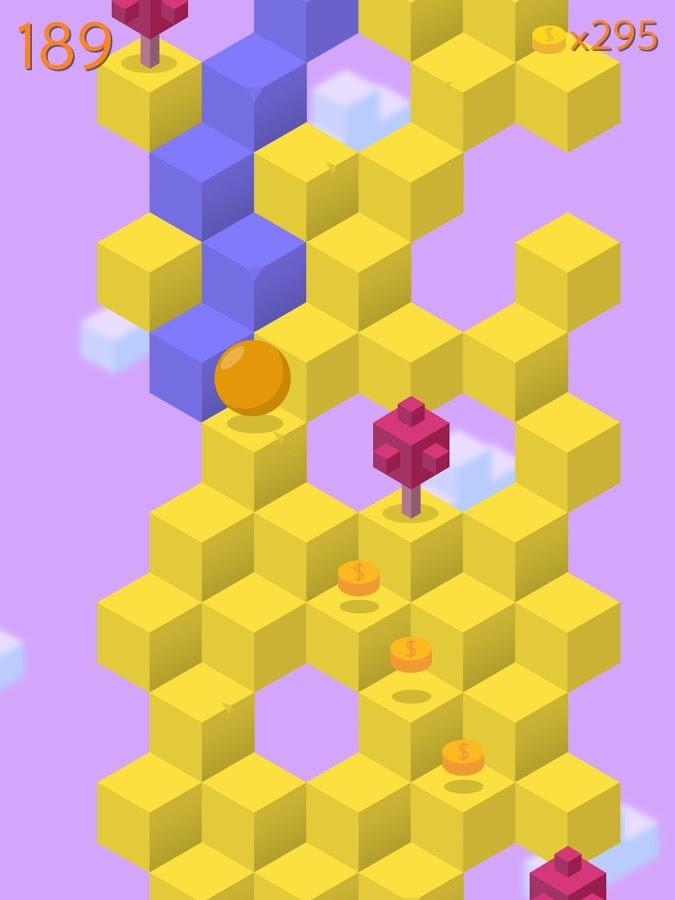 游戏操作很简单,戳屏幕,点击一次屏幕小球就会转换方向,然后无尽地往下掉。在场面上有许多空洞,一旦没在正确的道路上就会掉下去。这样说明似乎没有什么,但是游戏的反馈很坑爹,当你在需要转向的方块上点击拍屏幕几乎都不可能即使转向,一下子就到了下一个点。遇到只有一条通道的地方不就思路一条了?那么就预判提前按吧,这样又很容易提前转向,因为小球的下路速度很快,根本没有给人思考反应的时间,这样故意为难玩家想不懂用意何在。游戏中倒是有一些帮助的道具可以捡到,比如紫色方块可以让一段时间内没有空洞,绿色小球可以明确指出合适的前进路线,但是这都不足以弥补游戏的坑爹操作。最恶心人的是广告,这款游戏不仅在正下方一直存在着广告栏,在死亡2~3次后经常的满屏游戏让人心烦不已,我能理解免费游戏带广告,但是这么频繁出现真的好吗,有时心急按快了就进入appstore了,很是烦人。