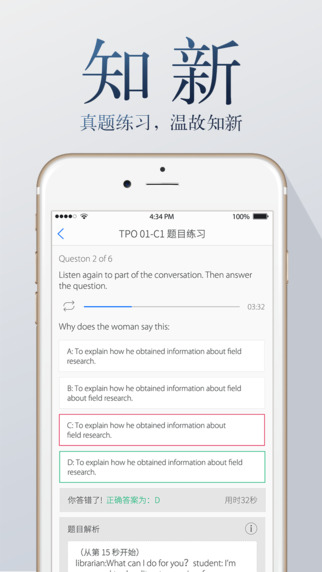 托福听听app专业为正在靠托福的学子们打造的托福英语听力练习应用,托福听听app包含TPO、老托福Part C和美国科学人60秒(SSS)等大量题库,多听听托福听听app托福英语听力就这么简单。