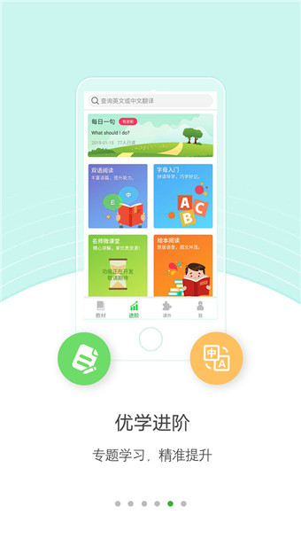 【教材】与当前主流教材同步,包含课本点读、课文动画、听课文、口语训练、语音评测等模块,轻松完成教材主题学习;并配套单词听写、趣味练习、听力训练、小升初专项测试等内容给学生在家里练习巩固。【进阶】提供绘本阅读、字母拼读、双语阅读、分级阅读、词汇学习、语法学习、名师微课堂等专项内容帮助学生提升英语学习水平。