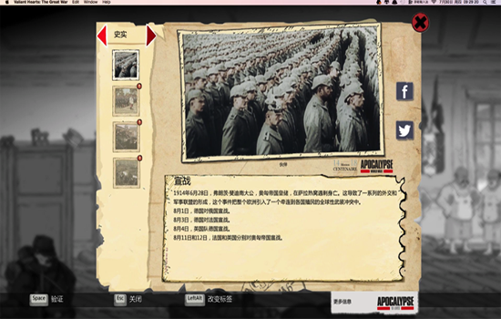勇敢的心世界大战Mac版游戏的剧情主要是讲诉了在战争中命运交织的4个男女和一个忠犬间的友谊、爱情的故事,虽然他们来自不同的国家,不过有一个共同的道路,那就是让一位年轻的德军士兵与他失去的爱重聚。游戏以一个小人物的视角来看待战争,试图描述其如何在被暴力统治的年代展现爱与英雄主义。而在操作中,玩家可以通过直观的触摸导航,来欣赏整个游戏的剧情内容,友情、爱情、牺牲和悲剧故事。在这本结合了动作、迷团和冒险内容独特的图像小说中,发生在4个无名英雄卷入第一次世界大战的无名英雄身上的故事。