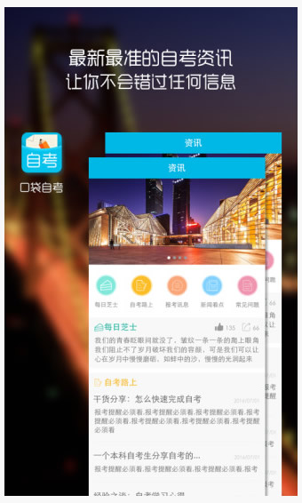 口袋自考app整理各类自考的考试、课程资讯,并实时推送到手机上,让你学习无忧!我们有最火热的自考社区,奋斗的路上你不在孤单!无论你是在校生还是社会考生,无论是自考本科、专升本还是其他自学考试补充学历学生,口袋自考你值得拥有