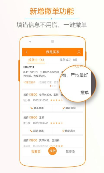 在这里,不锈钢买家可以发布找货信息,在短时间内接收到卖家报价,并可电话联系到卖家进行交易洽谈和确认。卖家通过平台即时推送的找货信息,即可及时出价,抓住交易机会,对接到买家轻松实现出货。