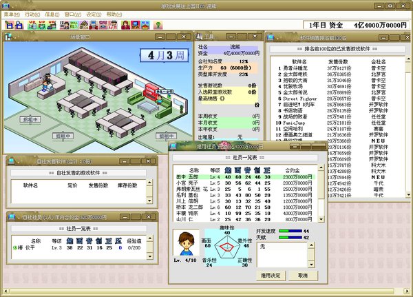 2、好了,言归正传,游戏一开始我们是一家含社长和秘书也只有六人的小小小游戏公司……所以首先要征人!员工的职业一开始有程序开发、剧本编写、图像设计、音乐作曲,玩到后期,还有其他能力值很高的职业,甚至透过事件,还会出现意想不到的超强员工!!当然要付的薪水也会多很多……
