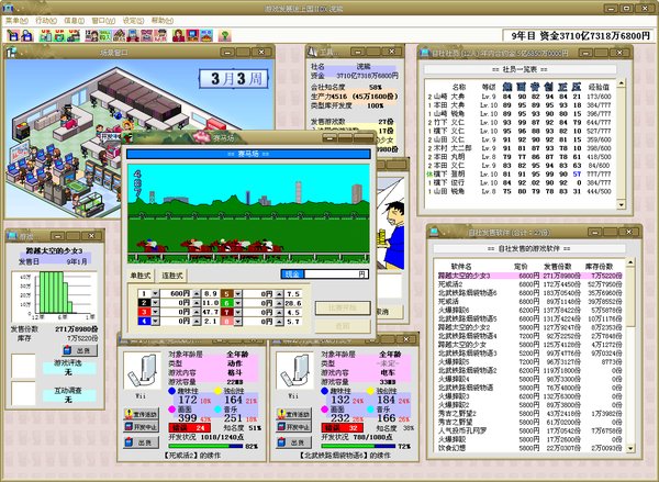 开发游戏:首先你要选择游戏的类型和内容。这两者的组合对游戏最终的销量会有很大的影响。要给其他主机开发游戏,你首先要获得相应的授权。接下来,你需要作出游戏的初始提案。你可以让有编剧才能的员工来做这件事,或是外包给更有能力的人,你的选择会影响到游戏的品质。在开发的过程中,你需要为游戏添加图像和声音,你可以用自己的员工或是选择外包出去。请注意,反复使用同一个人,会降低他的发挥水平。