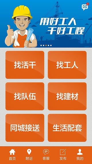 开通找活干、找工人、发布、附近找活干和找工人几个栏目。可以方便的在平台上找活干和找工人。