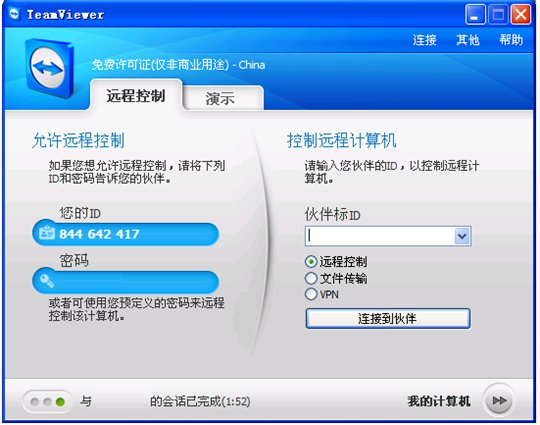 要进行远程控制,首先两方电脑都必须执行TeamViewer。 运行TeamViewer 后,TeamViewer的服务器会自动分配一个ID和密码给你,ID是固定的,但密码是随机的,每次执行都会不同。左边是您的ID和密码(若是对方要主动连你,要将此告诉对方),在右边输入对方的ID (连续输入不用空格)就可以连到对方了。   选择“远程支持”(Remote support)连线方式可以在您的电脑上显示对方的桌面,您可以控制对方的电脑就像自己在该电脑前一样。 (对方桌面右下角也会有个小小的控制视窗,可以让对方知道连线进来的人是谁,和控制「结束连线」与「聊天对谈」)
