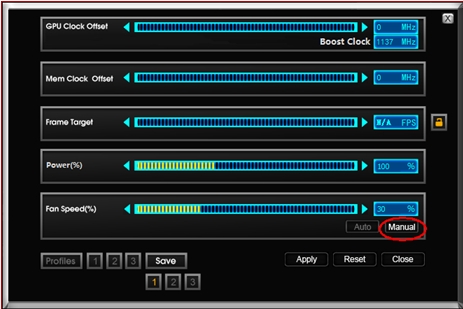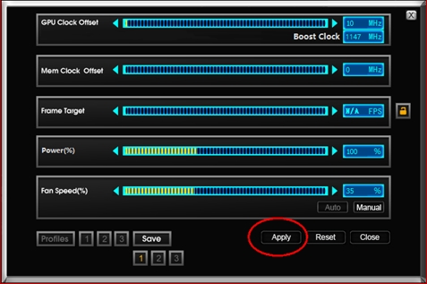 现在玩家们可以开始自由发挥啦,选择自己想要的频率和电压以及显卡风扇转速,点击Apply应用,如想恢复默认设置,点击Reset即可。