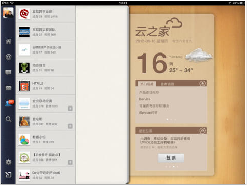 云之家是一个强大的企业社交平台,已荣获CCID最具价值互联网企业级产品奖。不分行业,面向所有企业员工,操作简单,用户就像在使用新浪微博一样。除了提供私密、安全的社交平台以外,云之家更关注企业的团队协作效率、文档分享和知识交流。云之家 for iPad 是专为iPad平板电脑用户设计的云之家客户端,精心设计的操作界面、新颖流畅的交互体验,让你以全新的方式随时随地使用云之家服务。让你可以随时随地使用云之家的服务,在工作中随时随地沟通、协作、分享。