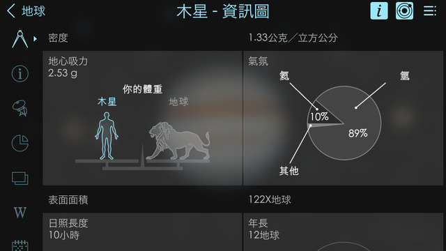 在默认情况下,整个太阳系都会都会进行动态运转,拖拽调整视角以及拉伸放大缩小视图都可以轻松实现,用户还可以自定义是否显示星球的运行轨迹,调整整体的运行速度等等,完全做到了360度无死角浏览。在这里用户可以检索的内容包括星球、人造卫星等等,然后我们可以查看每个星体的基本信息,如质量、引力、温度等等,信息的分类和表达都相当的通俗易懂,类比对象的挑选也比较恰当。