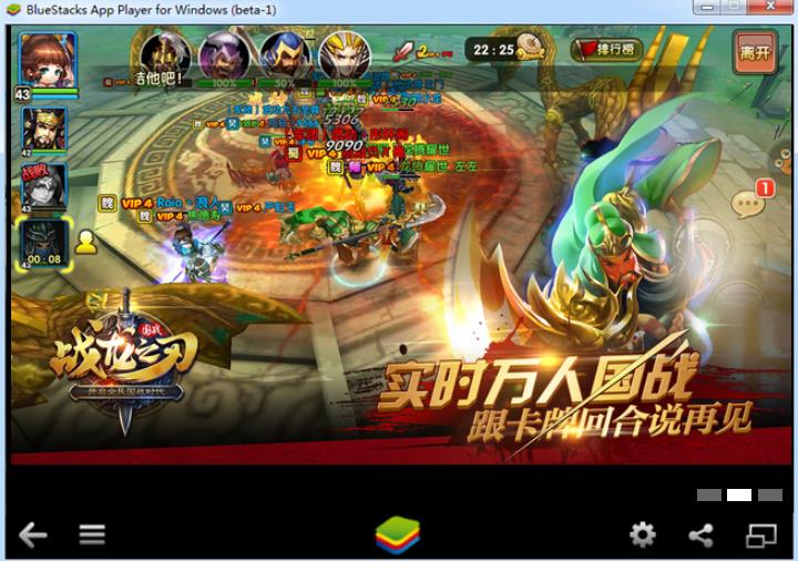 国战地图分为边境、华容道、虎牢关、王城这几个分图,从边境一路杀到王城,每个图有一个boss,国战时间是30分钟,在规定时间内杀死或守住王城boss就赢了。