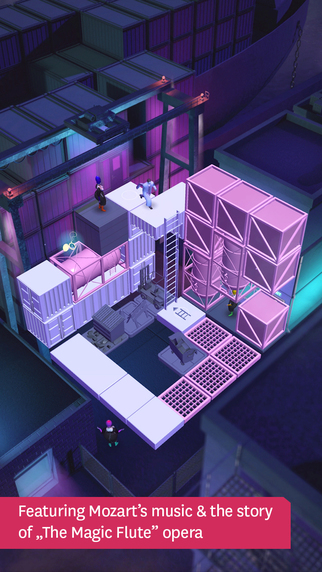 《魔笛》本身是莫扎特由童话剧本改编而成的杰出歌剧,第一次公演还是在200多年前了。而《莫扎特的魔笛》是以这出歌剧为背景,讲述了一群在歌剧院中与女王、巨蛇甚至是地震对抗的普通人求生的故事。在玩法上,本作采用了很少见的三维体力拼图,这与《纪念碑谷》的玩法有天壤之别。
