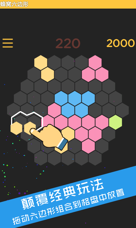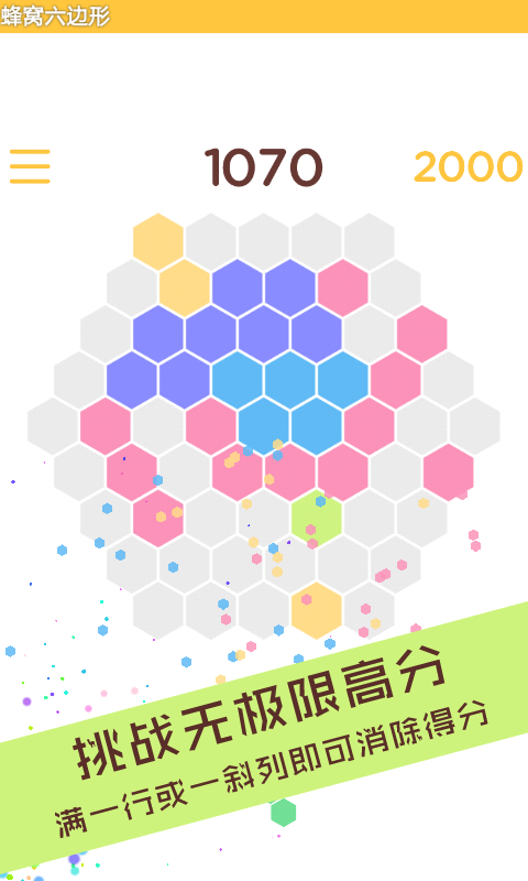 1、不受颜色控制,只要一行或者一斜列填满即可消除2、放置得分=10*六边形组合数