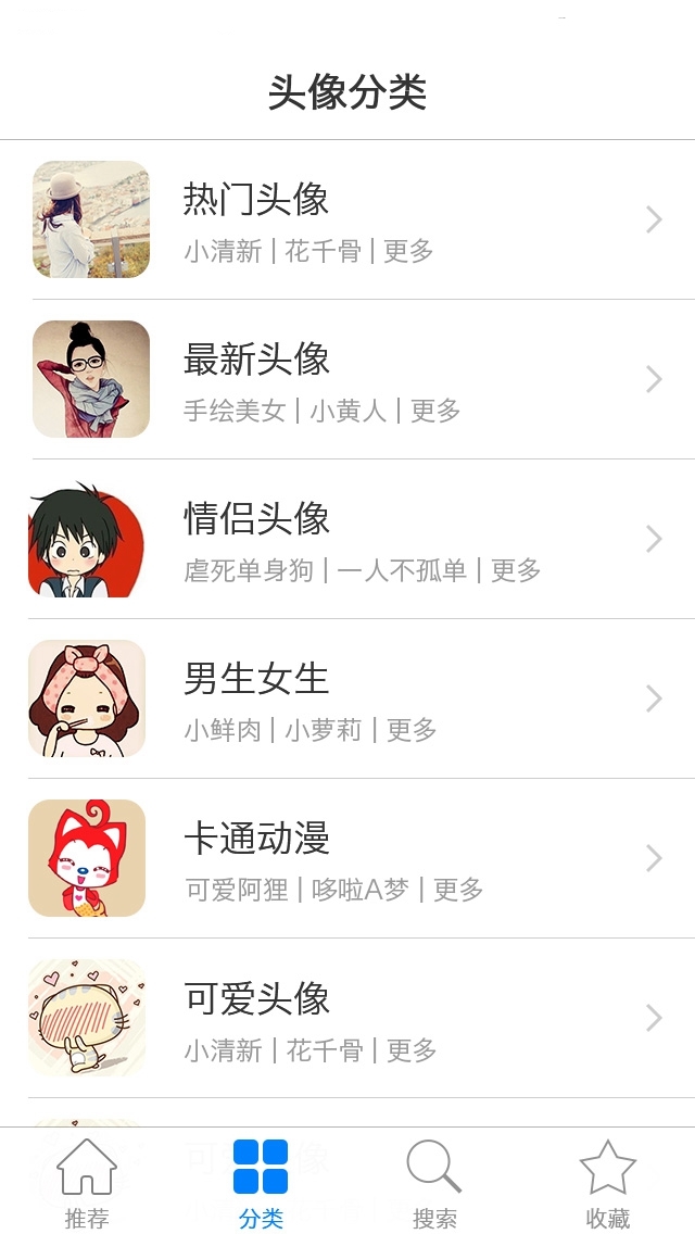 1.8大分类,200多个子类,分类清晰明确,快速找到喜欢的头像。
