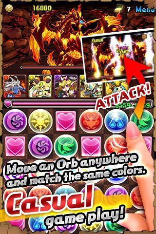 《火龙之怒(Puzzle & Dragons)》不是一款简单的三消游戏,拥有大量既可爱又华丽的宠物设定,充分结合了收集和养成要素。玩家需要对宠物的耐心捕捉与悉心培养;需要呼朋唤友,互帮互助;需要根据宠物的属性和技能操刀编队,合理组建冒险队伍;还需要掌握一定的消除手法。总之是一款饱含技巧、热情与耐心的游戏。它就是令人爱不释手,极易沉迷的Puzzle & Dragons《智龙迷城》(又译火龙之怒)。
