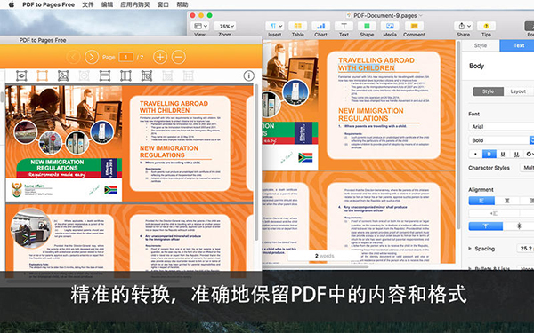 支持非扫描的PDF文档,即使原格式十分复杂,包括多个分栏,图片,表格,文本框,纵向文本等等,都能够最大程度地在Pages中保留原本PDF的格式。