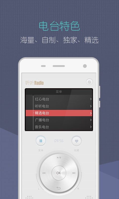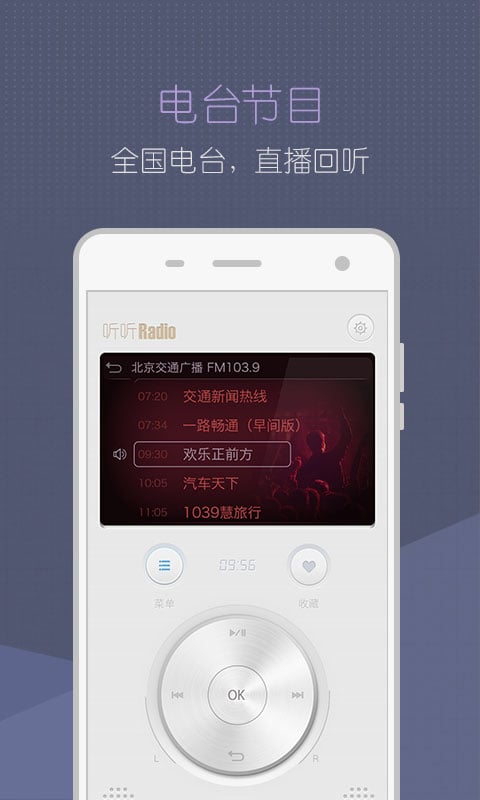 1、菜单与旋钮的结合听听Radio模拟传统调频收音机的转盘设计,跟传统收音机的使用体验更接近,却又比传统收音机使用起来更方便:您在收听电台的过程中,只需要旋转一下转盘,便可以快速切换到下一个电台。该转盘还集成了对节目单查看、音频控制等多项按键功能。同时,您还可以通过菜单,浏览听听Radio所收录的有超过3,000个全部电台节目。