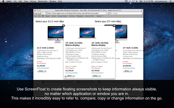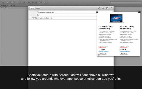 ScreenFloat 是一款能保持你所需要信息总是可见的小工具。ScreenFloat 会把你需要的相关部分进行截图,并且使这截图信息会浮显示在所有窗口的最前面。